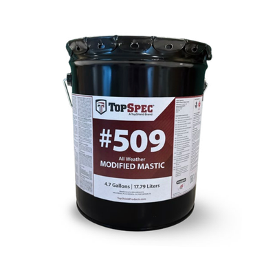 TopSpec™ #509 All Weather Modified Mastic is a heavy duty commercial grade rubber modified mastic specifically designed to be applied by the professional roofer under all weather conditions, wet or dry. #509 will bond under water for temporary or permanent repairs. #509 All Weather Modified Mastic is specifically designed for use with modified bitumen membranes, base sheets and ply sheets. The modified properties provides excellent adhesion, elongation and recovery characteristics. #509 All Weather Modified Mastic adheres to all surfaces wet or dry. Can be used on all flashings, around skylights, gutters, crevices, seams, flashings and repairs on SBS modified membranes. #509 All Weather Modified Mastic is excellent for repairs on conventional Built Up Roofing membranes where substrate movement is expected to occur.