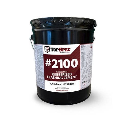 Product Description: TopSpec™ #2100 All Weather Rubberized Flashing Cement is specifically formulated for the professional roofer providing strong adhesion to wet and dry surfaces. Will bond under water for permanent repairs. #2100 All Weather Rubberized Flashing Cement is manufactured with superior oxidized asphalts for extreme durability. With its high SBS rubber content and fortified with Power Gel Technology, #2100 will remain highly resilient, flexible, and durable through all seasons.